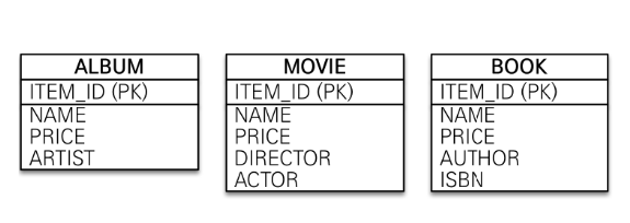 각 자식 클래스 별로 자신만의 테이블을 갖는데, 이때 부모가 갖고 있어야 할 고유한 속성들을 모든 자식 클래스가 자신의 테이블에 갖고 있는 방식이다.