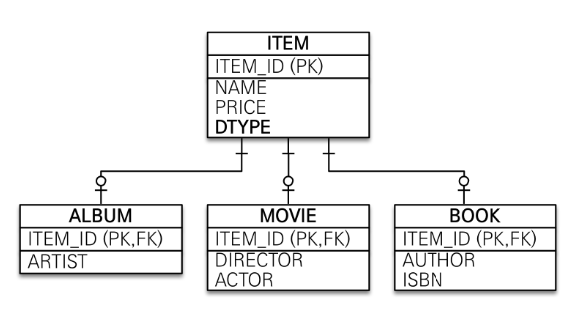 @DiscriminatorColumn // 자식 객체를 구분하기 위한 Dtype (싱글 테이블에선 명시하지 않아도 자동 생성됨)