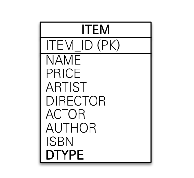 @Inheritance(strategy = InheritanceType.SINGLE_TABLE) // 전략 선택 안 하면 디폴트로 싱글 테이블 적용