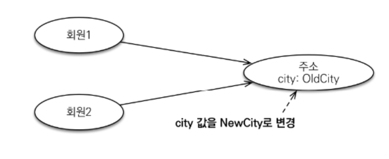 객체를 넘기면 값 자체를 넘기는 것이 아니라 참조값을 넘기기 때문에 이런 식으로 객체를 공유하면 한 엔티티의 속성을 변경했는데 객체를 공유하던 다른 엔티티의 속성까지 함께 변해버리는 문제가 발생할 수 있다.