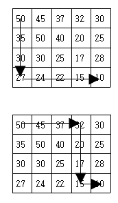 현재 제일 왼쪽 위 칸이 나타내는 지점에 있는 세준이는 제일 오른쪽 아래 칸이 나타내는 지점으로 가려고 한다. 그런데 가능한 힘을 적게 들이고 싶어 항상 높이가 더 낮은 지점으로만 이동하여 목표 지점까지 가고자 한다. 위와 같은 지도에서는 다음과 같은 세 가지 경로가 가능하다.