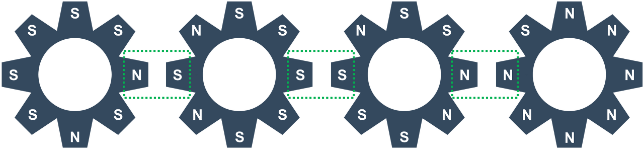 두 톱니바퀴의 맞닿은 부분은 초록색 점선으로 묶여있는 부분이다. 여기서, 3번 톱니바퀴를 반시계 방향으로 회전했다면, 4번 톱니바퀴는 시계 방향으로 회전하게 된다. 2번 톱니바퀴는 맞닿은 부분이 S극으로 서로 같기 때문에, 회전하지 않게 되고, 1번 톱니바퀴는 2번이 회전하지 않았기 때문에, 회전하지 않게 된다. 따라서, 아래 그림과 같은 모양을 만들게 된다.