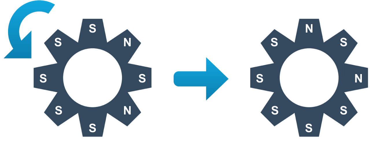 위와 같은 상태에서 1번 톱니바퀴를 시계 방향으로 회전시키면, 2번 톱니바퀴가 반시계 방향으로 회전하게 되고, 2번이 회전하기 때문에, 3번도 동시에 시계 방향으로 회전하게 된다. 4번은 3번이 회전하지만, 맞닿은 극이 같기 때문에 회전하지 않는다. 따라서, 아래와 같은 상태가 된다.