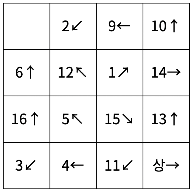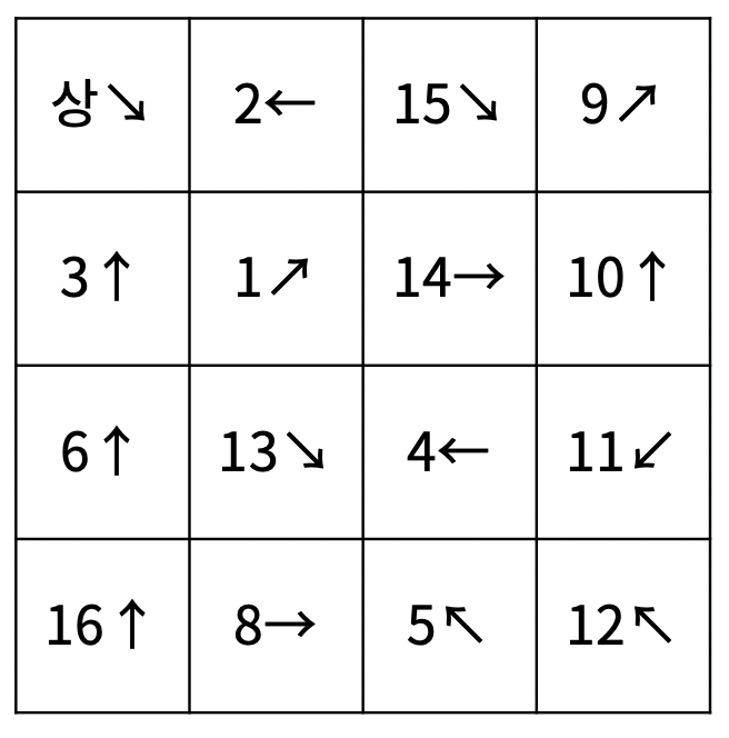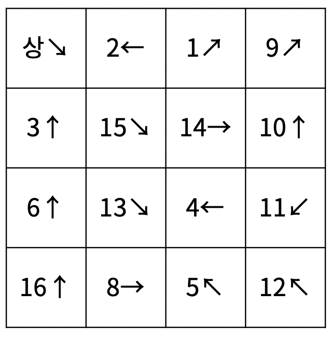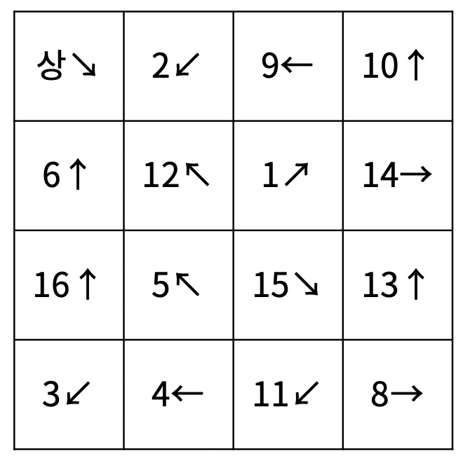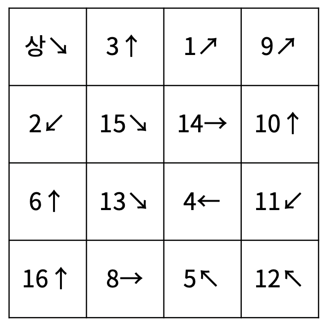 첫째 줄부터 4개의 줄에 각 칸의 들어있는 물고기의 정보가 1번 행부터 순서대로 주어진다. 물고기의 정보는 두 정수 ai, bi로 이루어져 있고, ai는 물고기의 번호, bi는 방향을 의미한다. 방향 bi는 8보다 작거나 같은 자연수를 의미하고, 1부터 순서대로 ↑, ↖, ←, ↙, ↓, ↘, →, ↗ 를 의미한다.